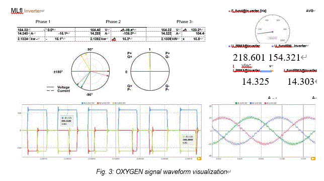 Fig. 3은 OXYGEN의 예시 측정 화면을 보여주며, 좌측 하단에는 AC 전압 파형이, 우측 하단에는 AC 전류 파형이 표시됩니다.