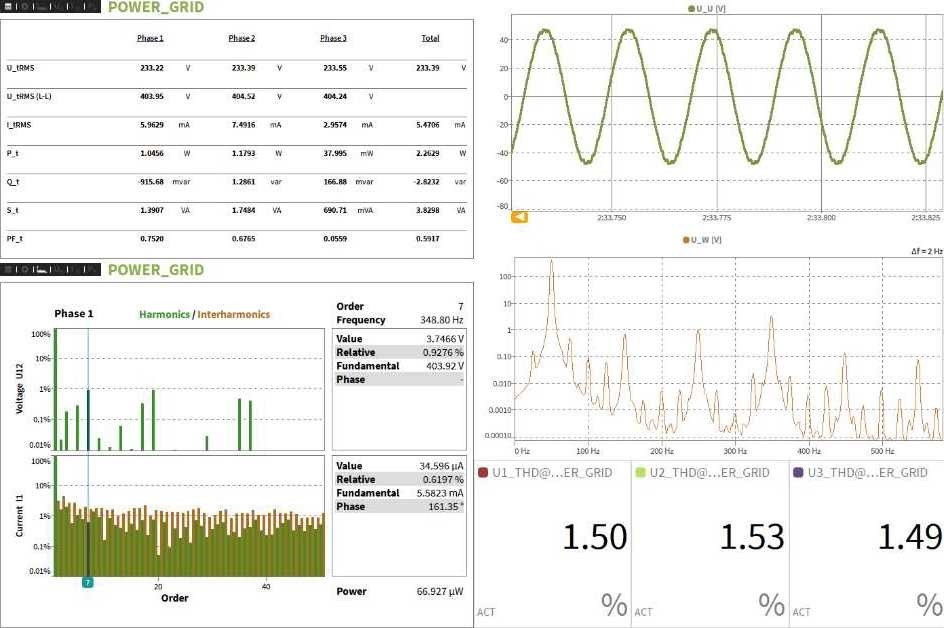그리고 위 그림에 표시된 기본파와 벡터 다이어그램을 포함하여 전력값 P, Q, S, U, I를 표시하는 전력 계기 등 더 많은 기능들이 있습니다